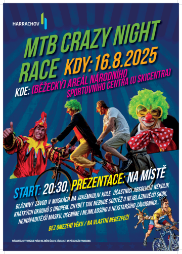 Celý program zakončí ve 20:30 originální MTB CRAZY NIGHT RACE – noční závod v maskách s dropy, triky a zábavou. Hodnotí se nejen čas, ale i kreativita – nejlepší masky, skoky a show budou po zásluze odměněny. Vyhlášení celého sobotního programu proběhne ve 21:45.