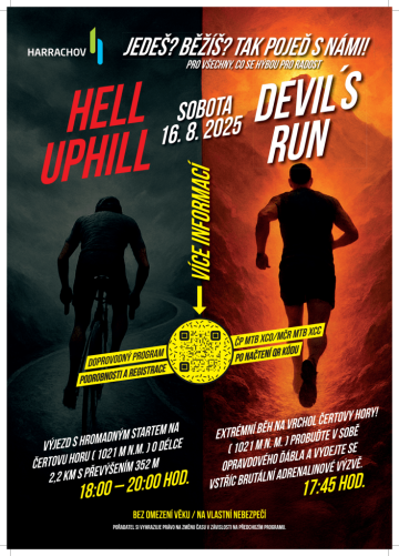 Extrémní běh na vrchol Čertovy hory! ( 1021 m n. m. ) Probuďte v sobě opravdového ďábla a vydejte se vstříc brutální adrenalinové výzvě, která oddělí zrno od plev už v prvních metrech. Na trase dlouhé 1,9 km s převýšením 356 m zažijete skutečný očistec. Po zdolání pekla, Vás však čeká endorfinový ráj a velmi hodnotné ceny!