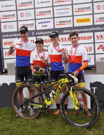 Kvarteto bikerů Expres CZ Tufo Kolín ve složení Filip Jech, Karolína Bedrníková, Tereza Tvarůžková a Jakub Kučera ovládlo dnes na domácím šampionátu v Harrachově závod štafet. Mezi žáky titul obhájil tým Adastra posílený o sestry Gottwaldovy z celku CP Team.